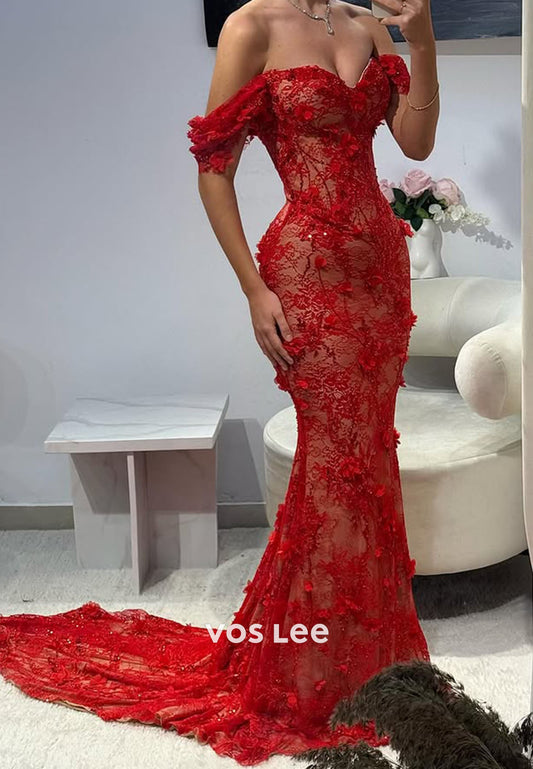 Red Off the Shoulder Sweetheart Flowers Appliques Lace Mermaid Prom Dresses