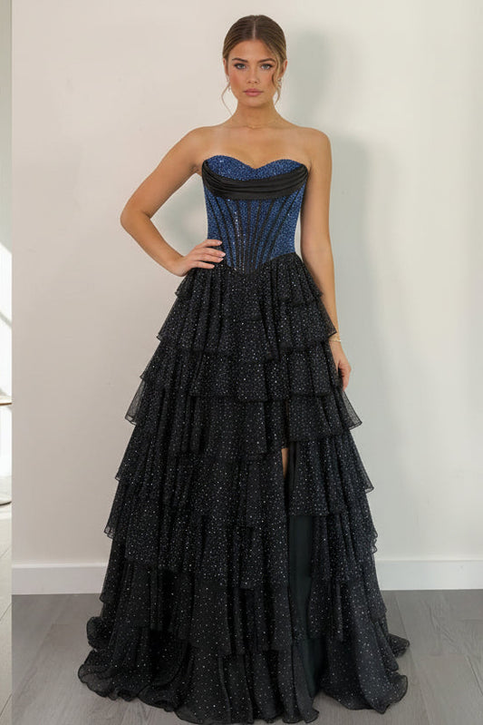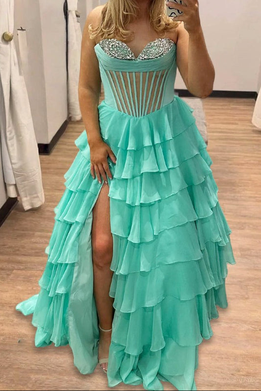 Strapless A Line Corset Bodice Chiffon Ruffle Prom Dress with Slit