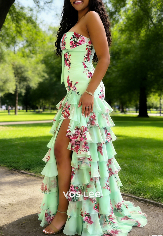 Strapless Mermaid Chiffon Ruffled Split Formal Prom Dresses With Bow