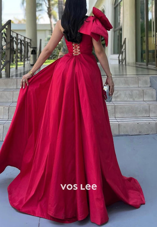 Classic A-Line One Shoulder Bowknot Pleats Prom Dresses with Side Split