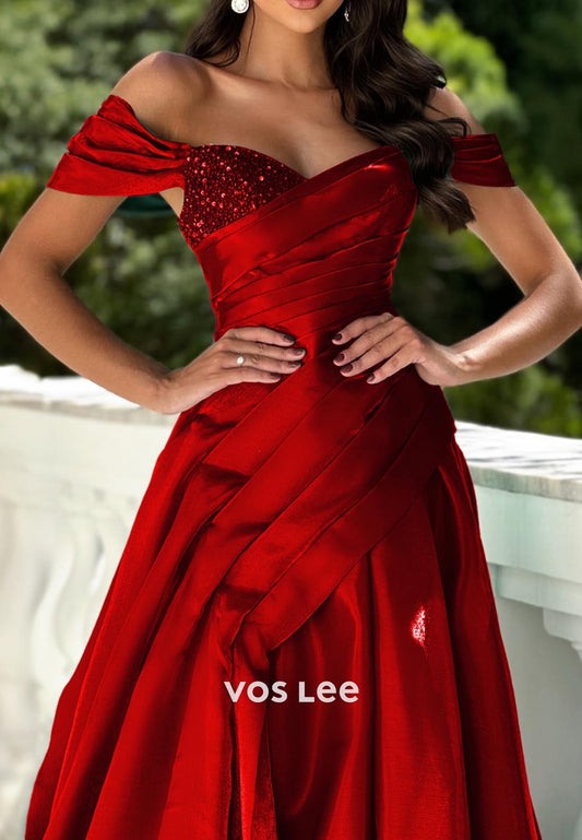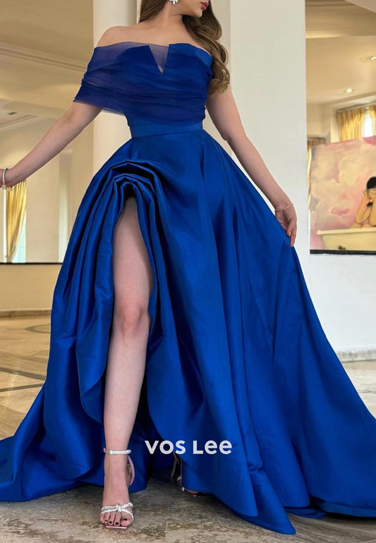 Classic & Timeless Off-Shoulder Rhinestone Pleated Prom Dresses with Court Train