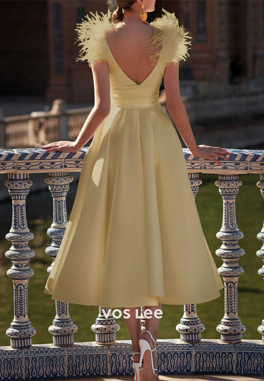 A-Line Low V-Neck Pleated feather Sexy Evening Dress Midi Dresses