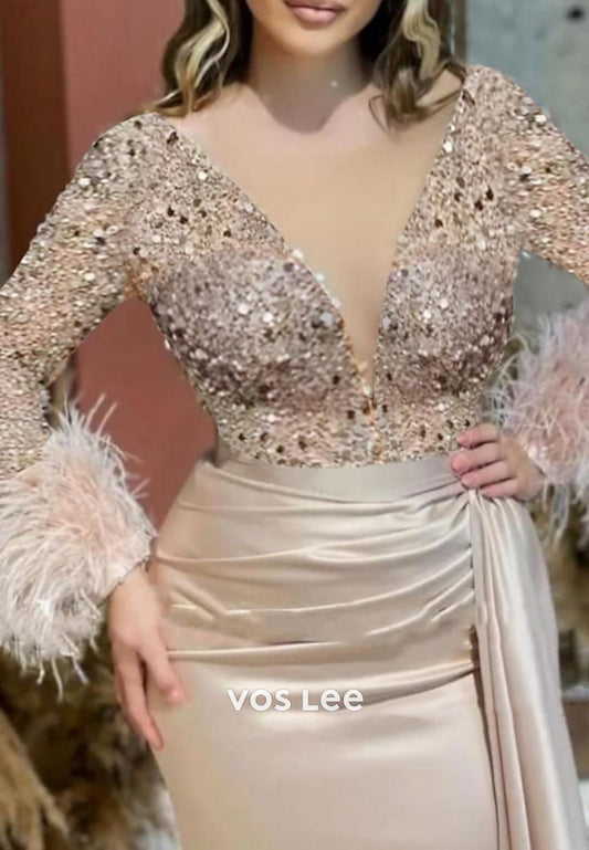 Sparkling V Neck Long Sleeves feather Mermaid Evening Dress with Court Train