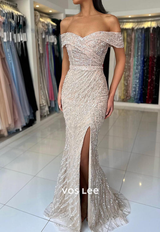 Allover Sequined Off-Shoulder Ruched Mermaid Prom Dresses with Sweep Train