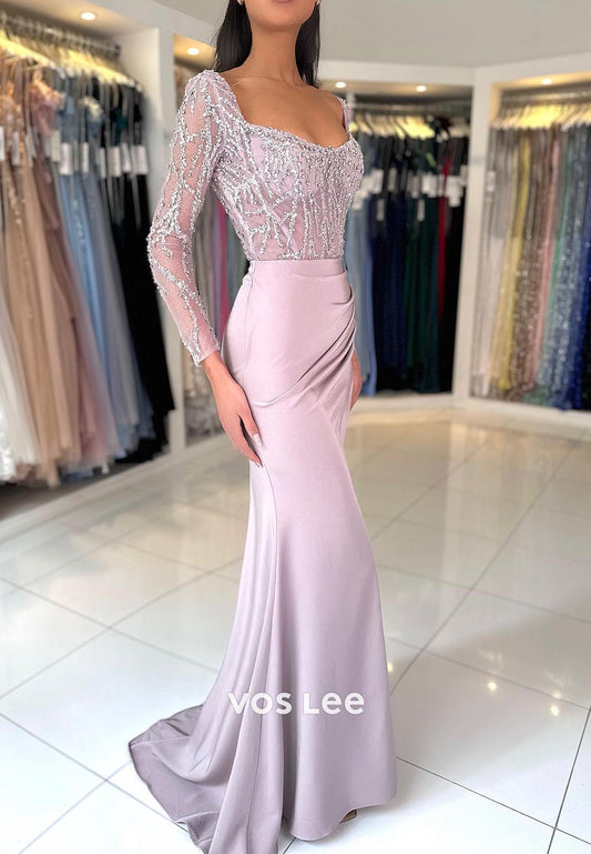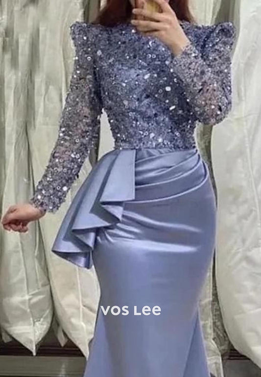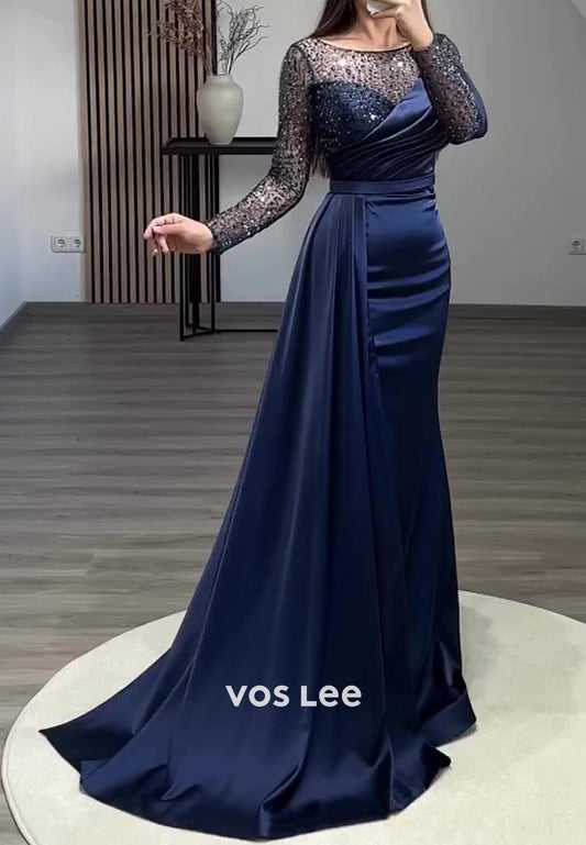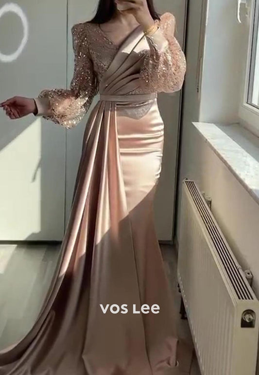 Long Sleeves Ruched Sequined Mermaid Evening Dress with Sweep Train