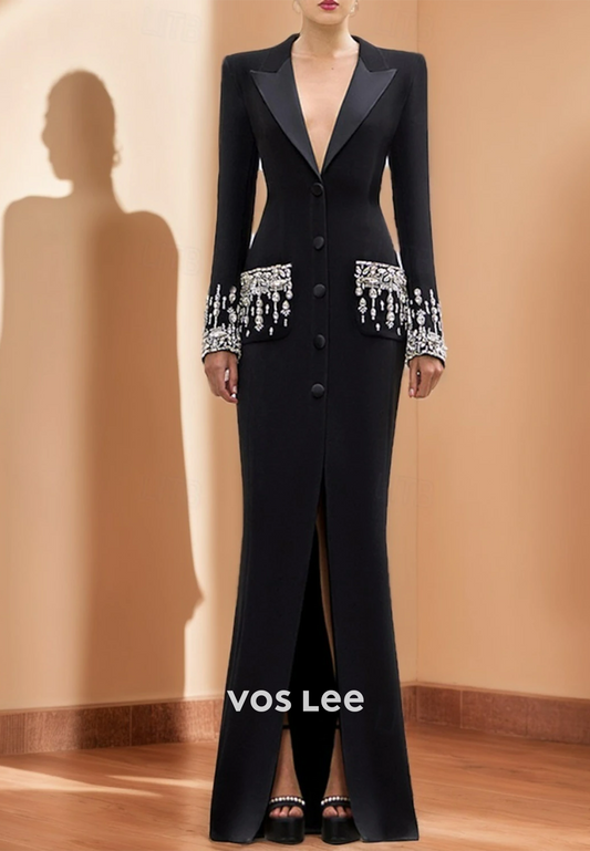 Glamorous & Dramatic Black V-Neck Rhinestone Long Sleeves Evening Dress