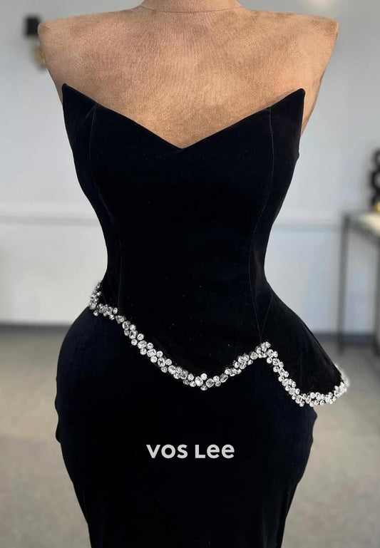 Black V Neck Rhinestone Mermaid Formal Dresses with Brush Train