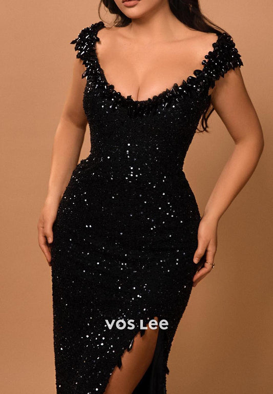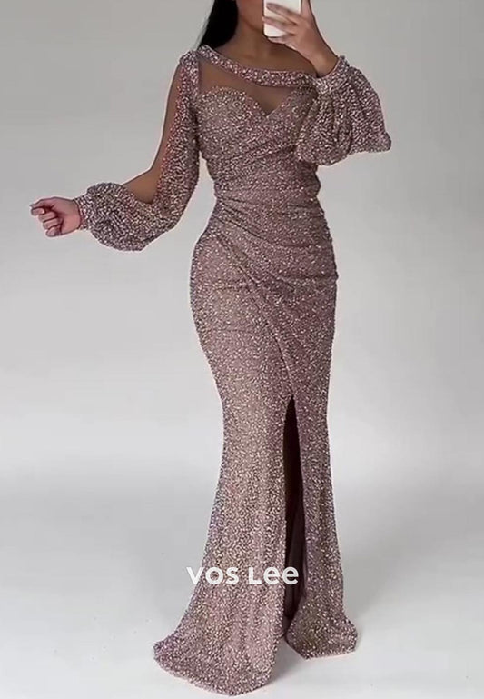 Glamorous & Dramatic Sequined Pleated Mermaid Prom Dresses with High Split