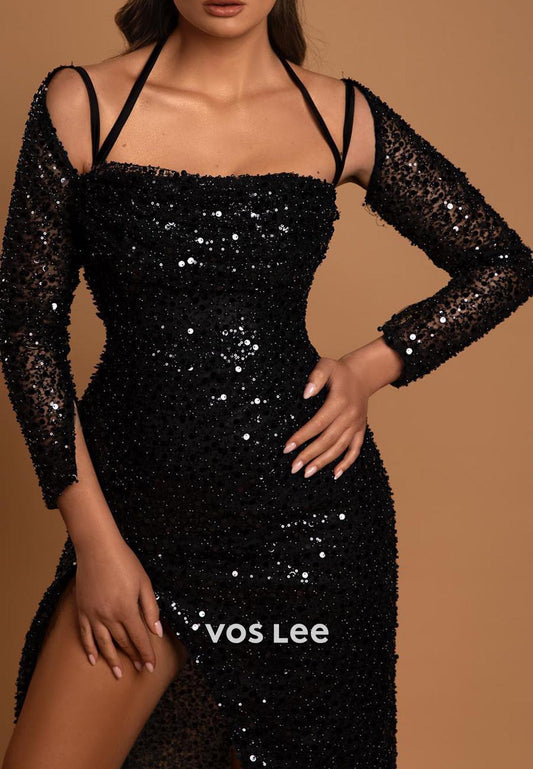 Long Sleeves Sequined Prom Dresses Formal Dresses with Detachable Court Train