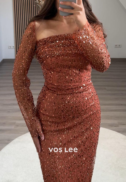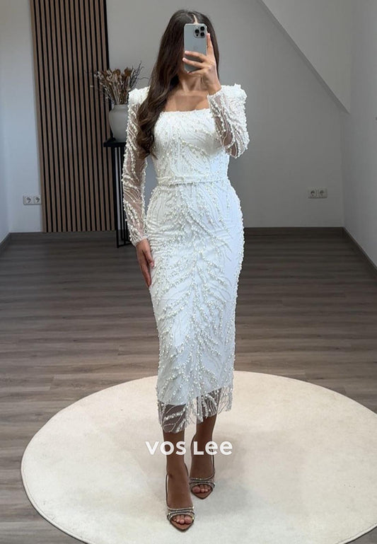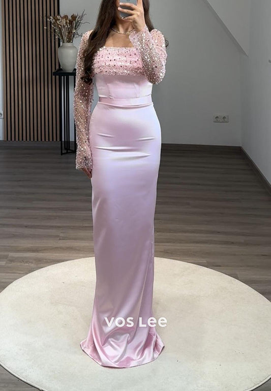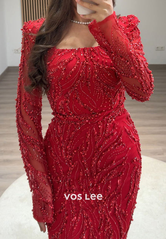 Full Beaded Square Evening Dress Long Sleeves Sheath Formal Party Gown