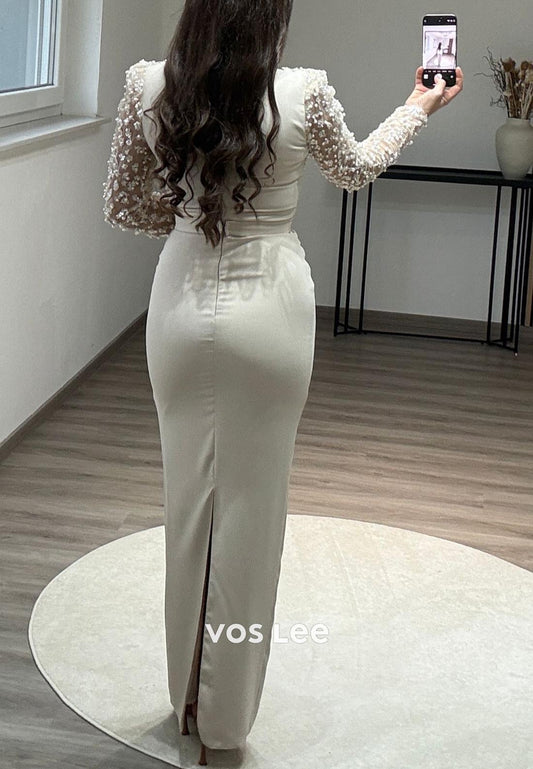 Graceful Column V Neck Illusion Long Sleeves Side Split Sequins Prom Party Dress