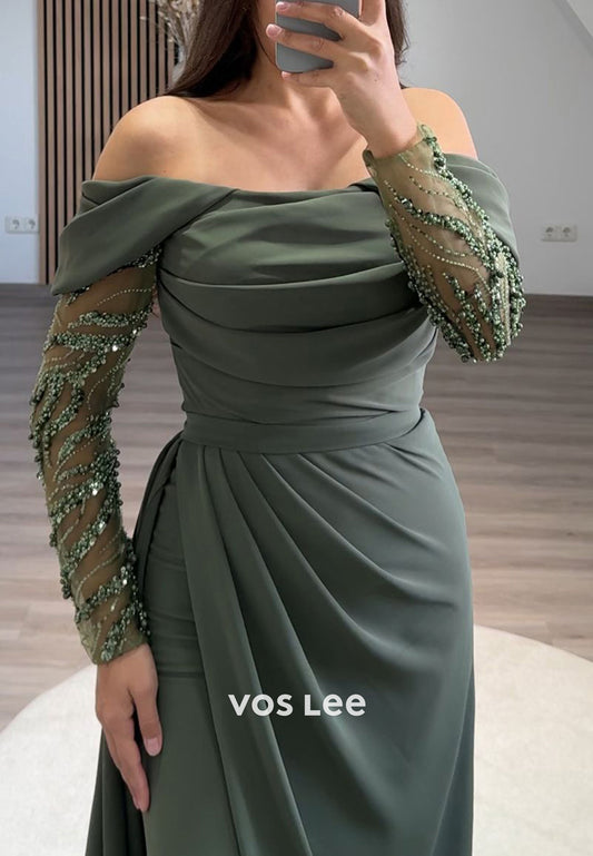 Formal Beaded Off Shoulder Sleeves with Train Sheath Evening Party Dress
