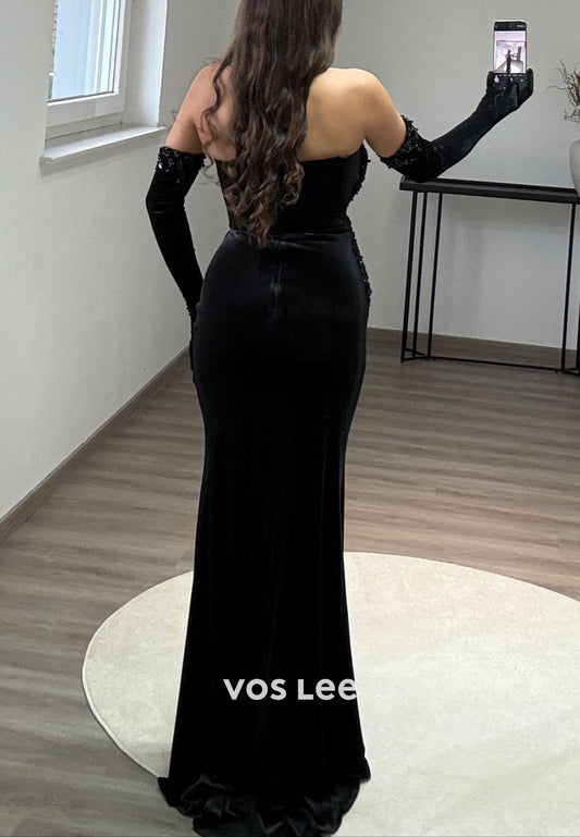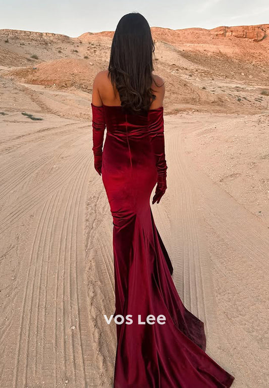 Strapless Velvet Ruched Strapless Pearl Mermaid Long Formal Dresses with Long gloves