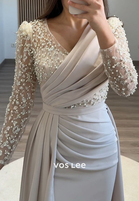 Formal Beaded V Neck Long Sleeves with Train Evening Dress Party Gown