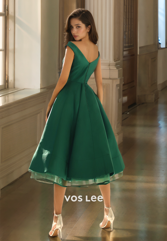 Dark Green V-Neck Tiered Women A-Line Satin Evening Dress Formal Party Gown