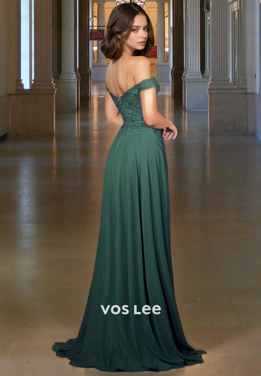 Graceful A-Line Off Shoulder Back Zipper Sweep Train Lace Appliques Prom Party Dress