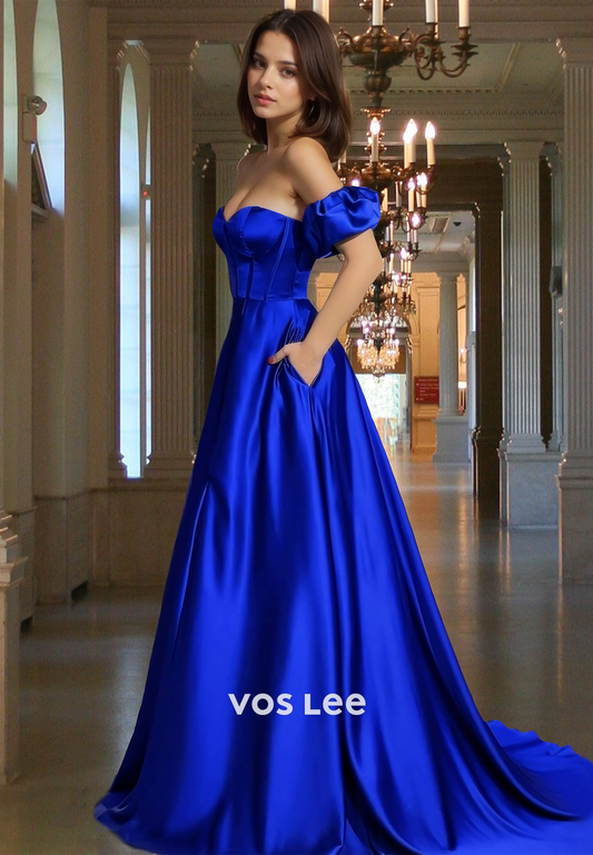 Modest A-Line Off Shoulder Royal Blue Back Zipper Prom Formal Dress with Split