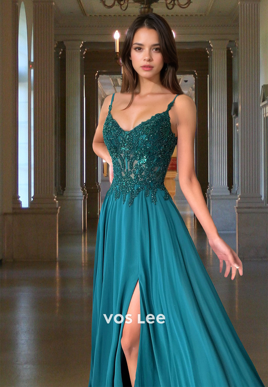Vintage A-Line V Neck Spaghetti Straps Lace Appliques Sequins Prom Formal Dress