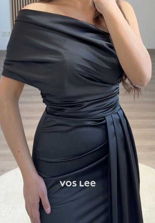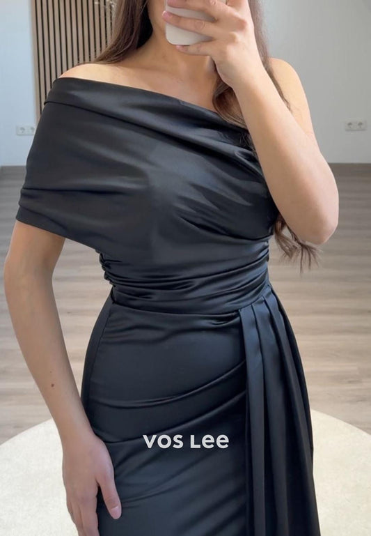 Formal Solid Black One Shoulder Ruched Sheath Satin Evening Party Dress