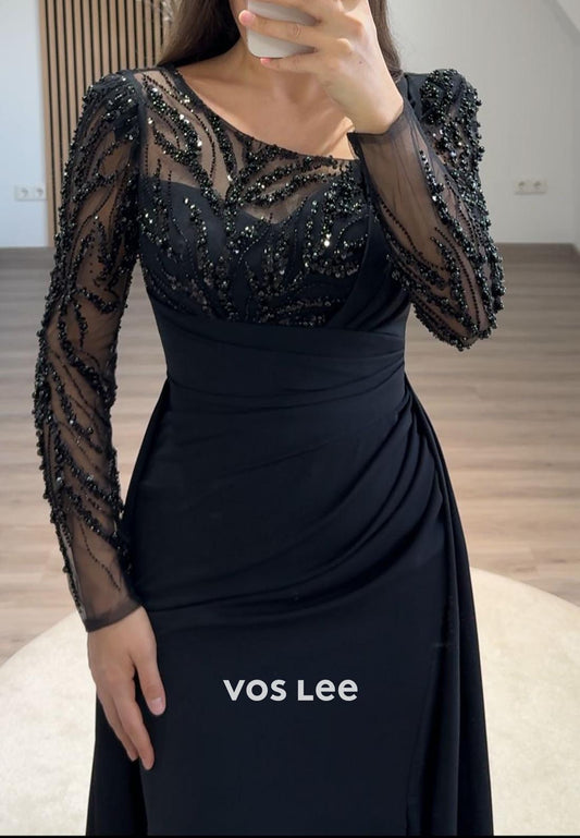 Simple Beaded Long Sleeves Trumpet Evening Dress Formal Party Gown