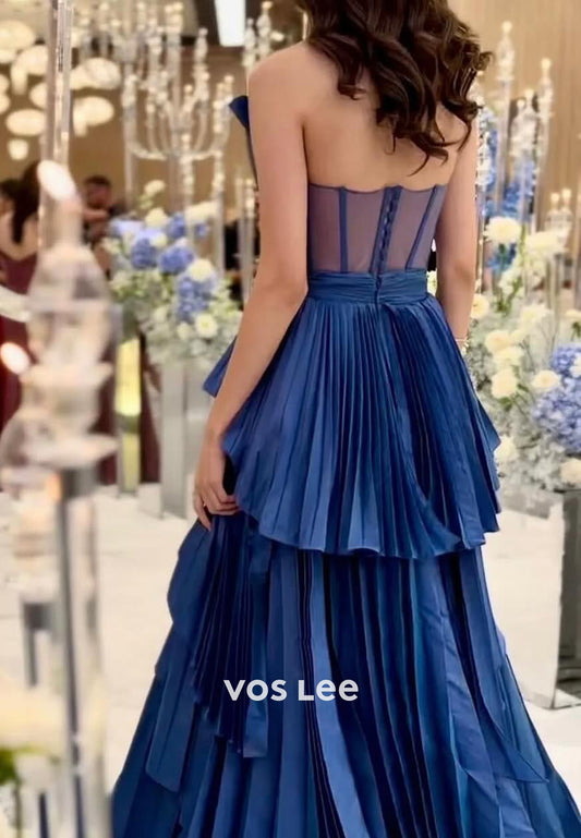 Chic Blue Asymmetrical Tired Ruffles Belt with Slit Evening Prom Dress Ball Gown