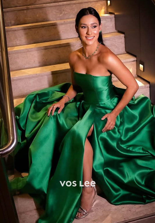 Solid Green Strapless with Slit A-Line Evening Dress Formal Party Dresses