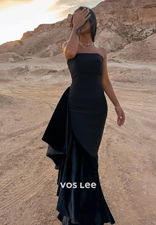 Elegant Black Fitted Ruffles Sheath Strapless Evening Dress Formal Party Gown