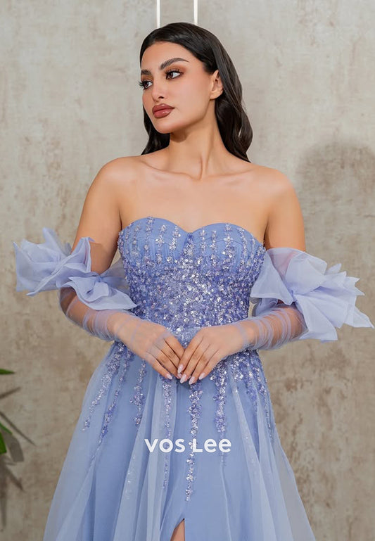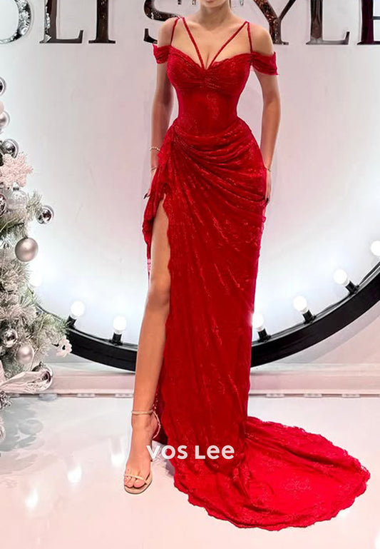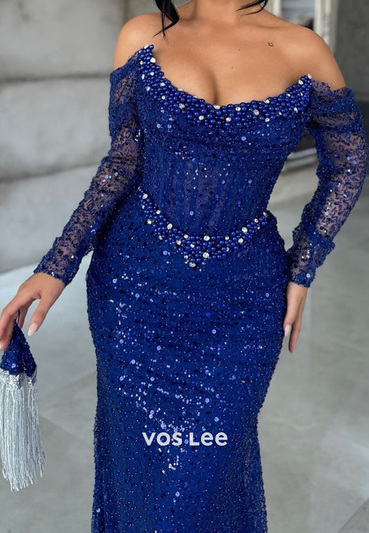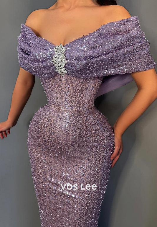 Luxury Column Off Shoulder Back Zipper Side Split Sequins Beaded Prom Party Dress