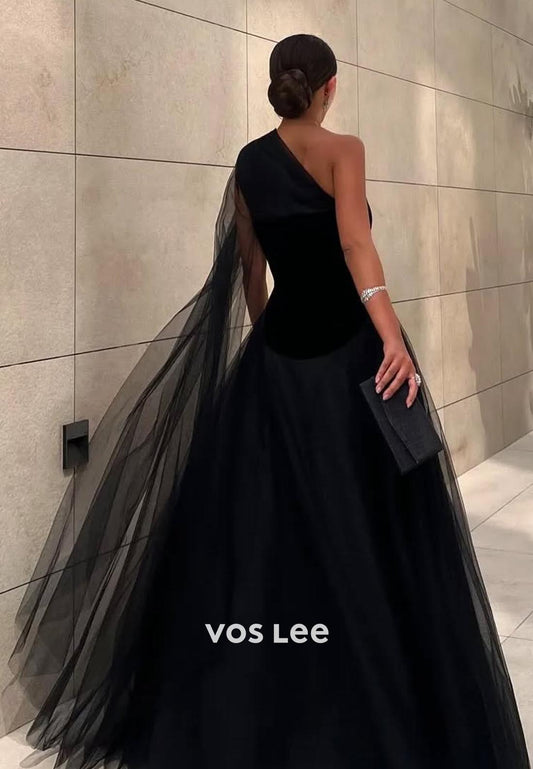 Couture Black A-Line One Shoulder Ruched EveningFormal Dresses