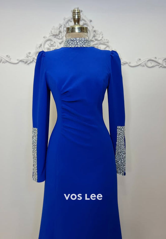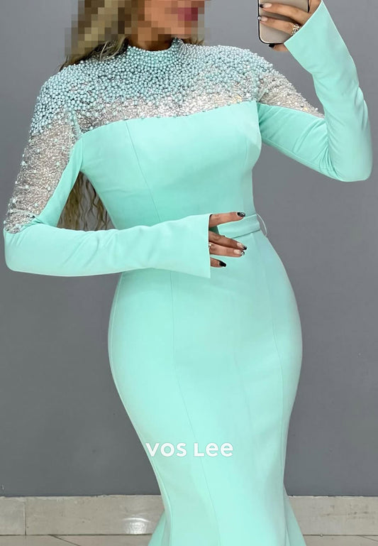 High Neck Pearls Long Sleeves Mermaid with Train Party Evening Dress