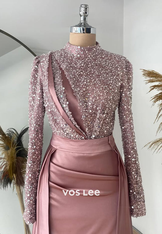 Sparkle Sequined Long Sleeves Evening Dress Classic Satin Formal Party Gown