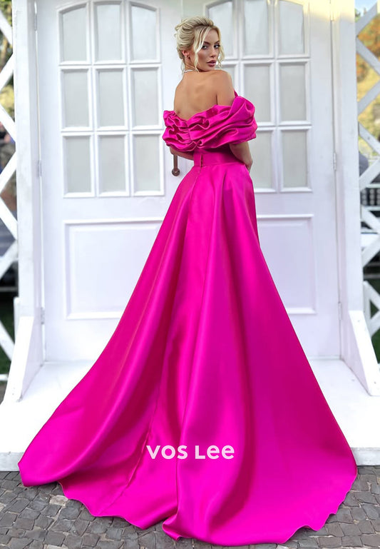 Chic Ruched Off-Shoulder A-Line Solid Fuchsia Evening Dress Formal Party Guest Gown