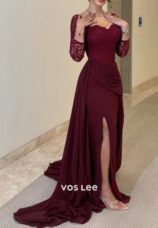 Long Sleeves Lace Ruched Mermaid Evening Formal Dresses with Court Train