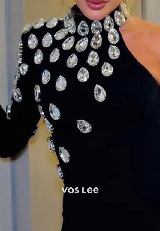 Black Long Sleeves High Neck Rhinestone Formal Dresses with High Slit