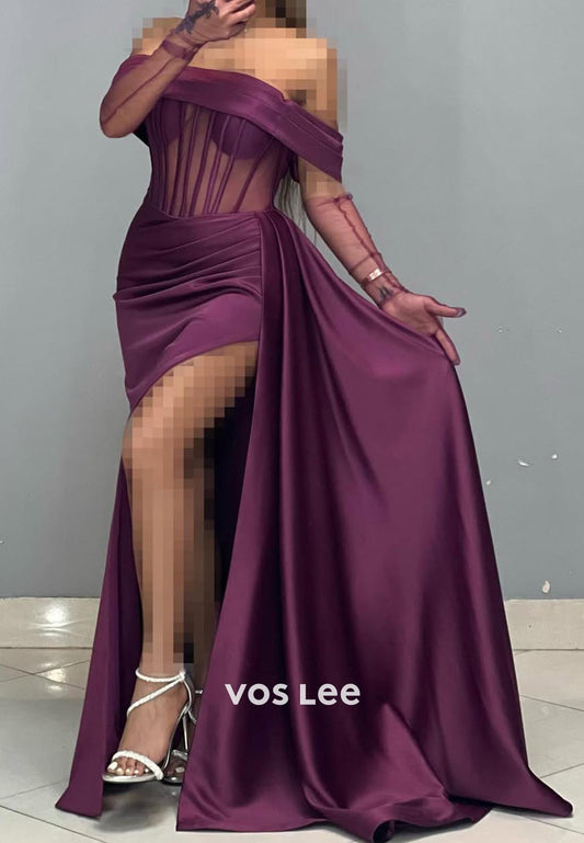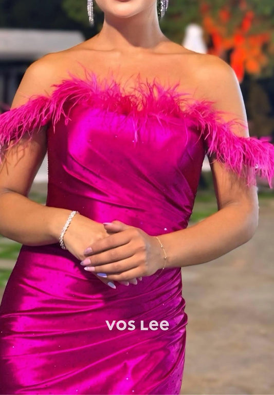 Off-Shoulder feather Mermaid Ruched Evening Formal Dresses with High Slit