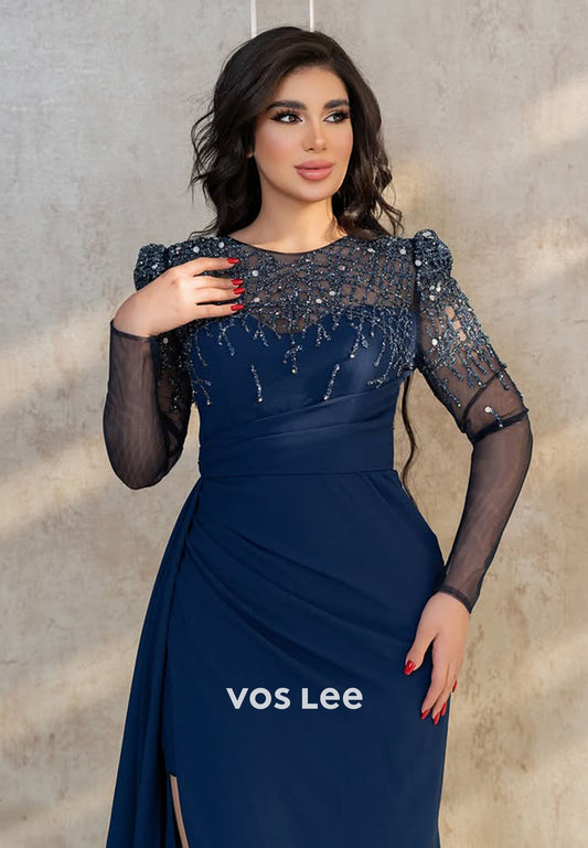 Navy Blue Beaded Sequined Long Sleeves with Train Formal Evening Prom Dress