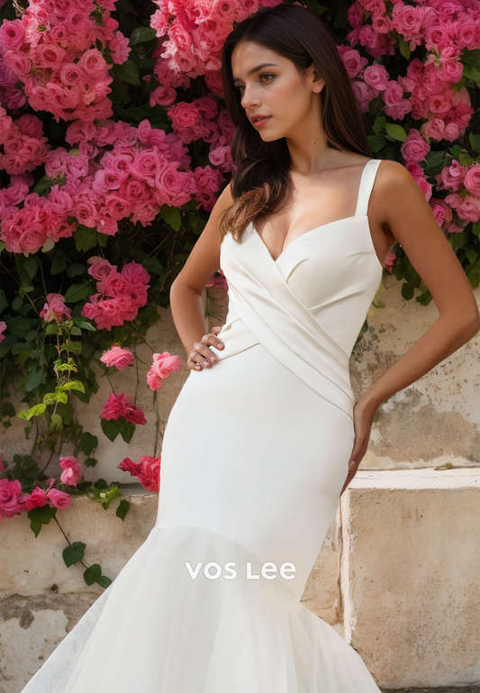 Gorgeous Sheath Spaghetti Straps Backless Mermaid Tulle V Neck Court Train Satin Wedding Gown