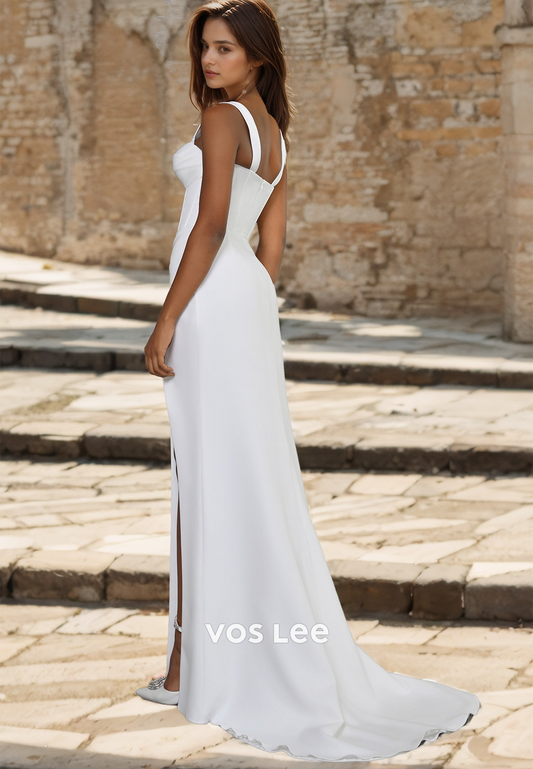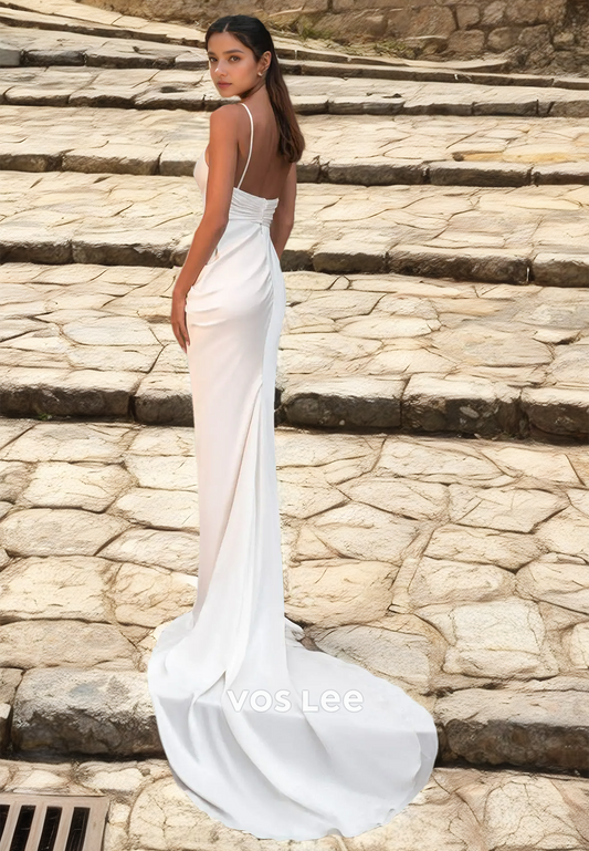 Modest Sheath Spaghetti Straps High Split Backless Sweep Train Draped Satin Wedding Dress