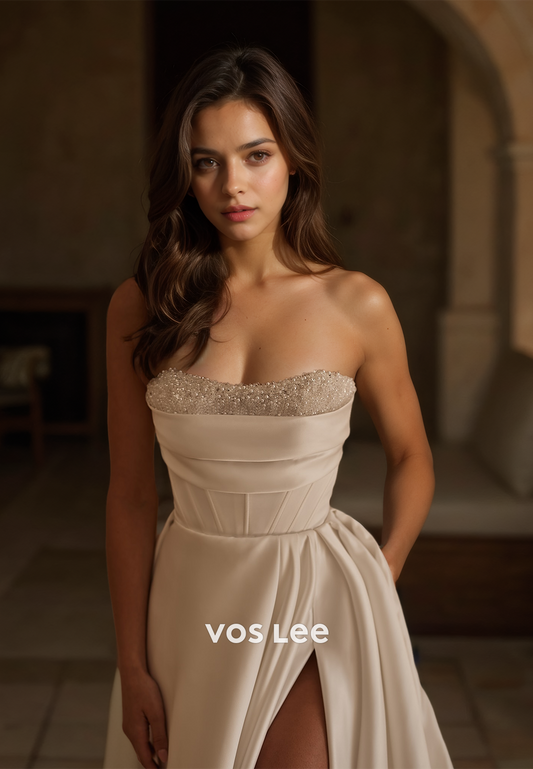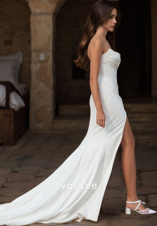 Simple Sheath Strapless Back Zipper Sweep Train Ruched Satin Wedding Guest Dress with Split