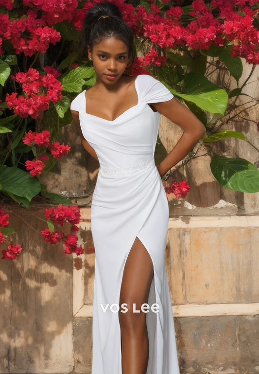 Modest Off Shoulder Sheath High Split Ruched Back Zipper Sweep Train Satin Wedding Bride Dress