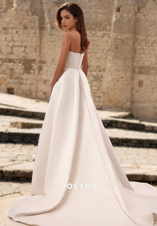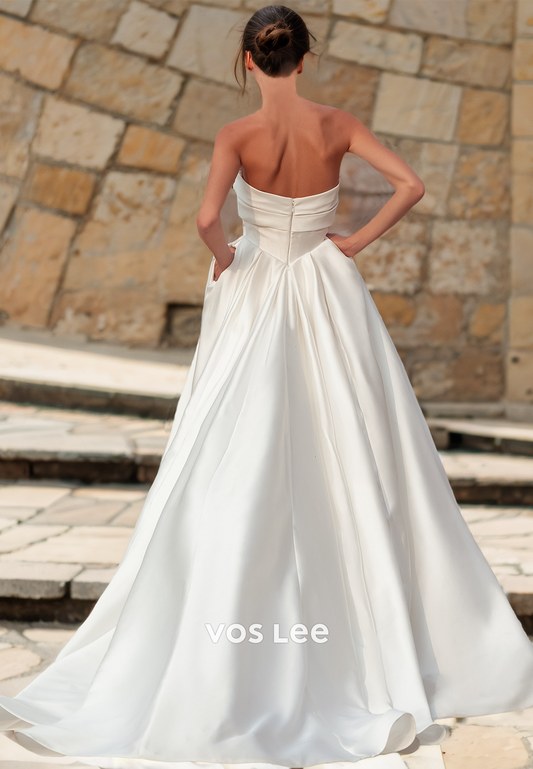 Simple Strapless A-Line Sleeveless Court Train Draped Bow Backless Satin Wedding Bride Dress