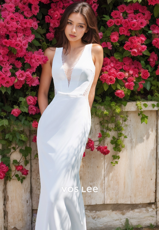 Sexy Deep V Neck Column Court Train Backless Mermaid Lace Appliques Satin Wedding Dress