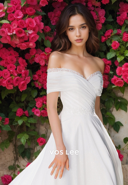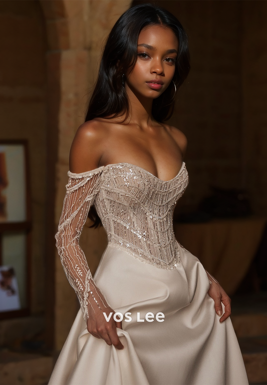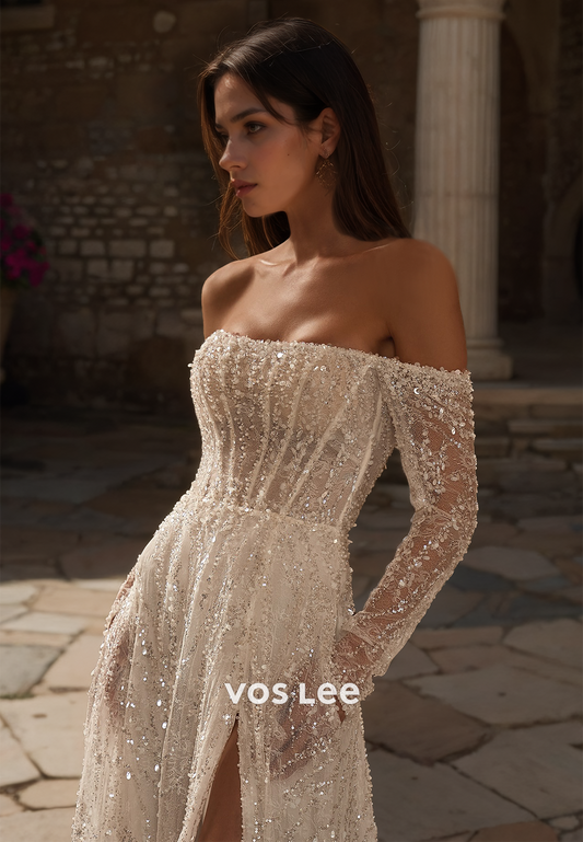 Graceful Off Shoulder Long Sleeves A-Line High Split Sequins Ruched Wedding Dress Glitter