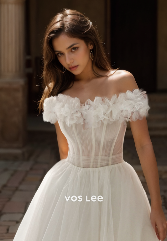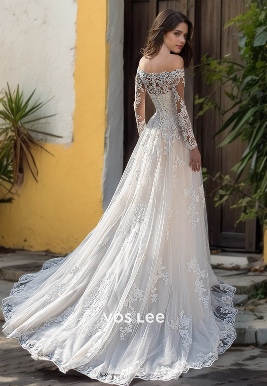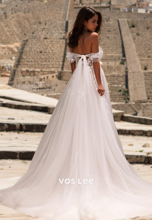 Charming A-Line Off Shoulder Backless Court Train Lace Appliques Tulle Wedding Dress with Split