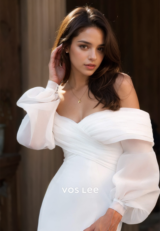 Elegant Column Off Shouler Long Sleeves Mermaid Sweep Train Draped Satin Wedding Dress