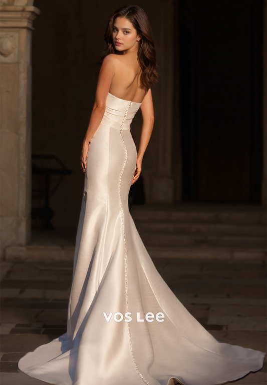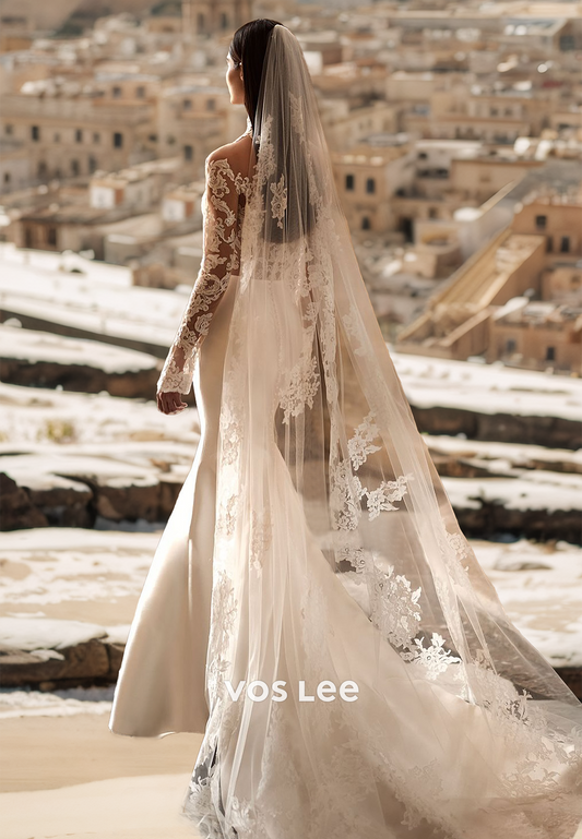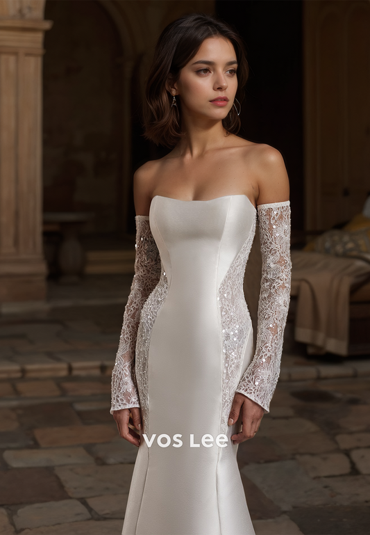 Modest Strapless Long Sleeveless Mermaid Sheath Sweep Train Lace Appliques Satin Wedding Dress