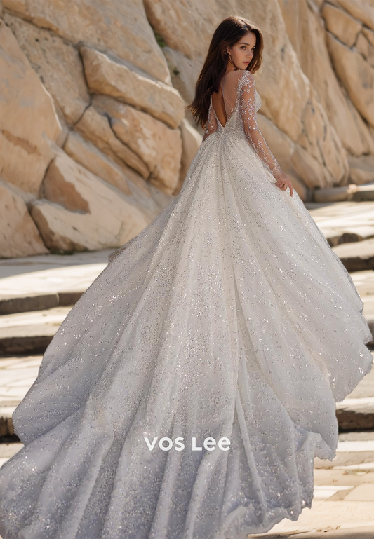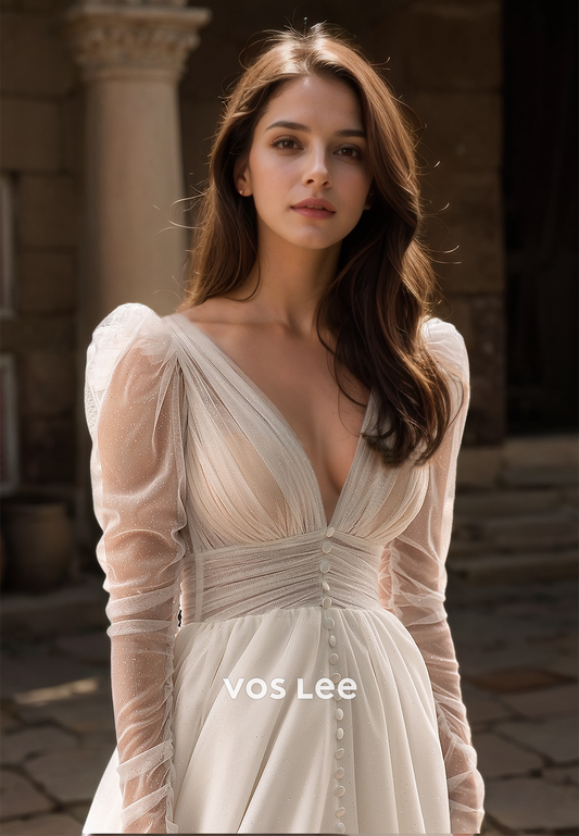 Sparkly Long Sleeves A-Line Deep V Neck Backless Side Split Draped Tulle Wedding Bride Dress