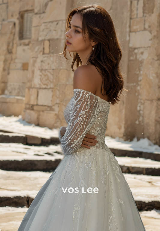 Ornate Off Shoulder A-Line Long Sleeves Pleated Lace Appliques Sequins Tulle Wedding Gown