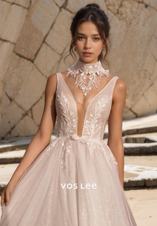Unique Deep V Neck Illusion A-Line Sleeveless Lace Appliques Sequins Pleated Tulle Wedding Dress