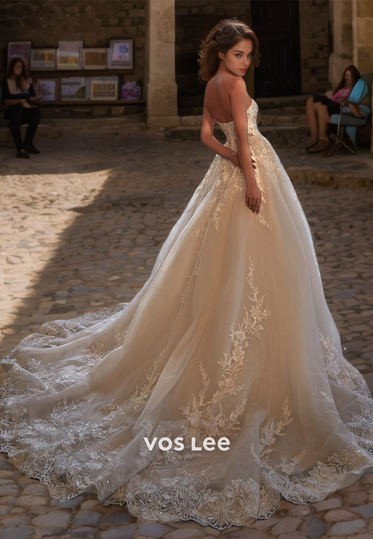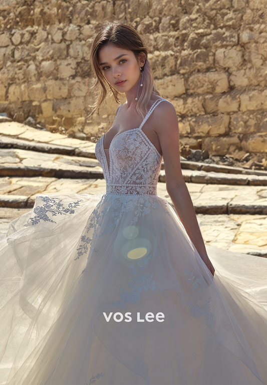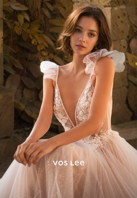 Gorgeous Deep V Neck Illusion A-Line Spaghetti Straps Lace Appliques Tulle Wedding Bride Dress